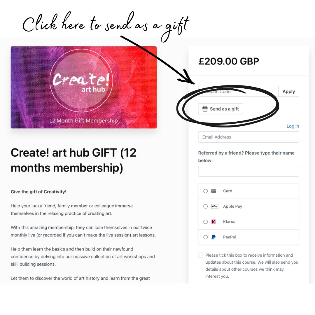 The recipient will have access for the art hub for 12 months from the point of receiving their gift. You can arrange for the gift to be sent on a date of your choice.